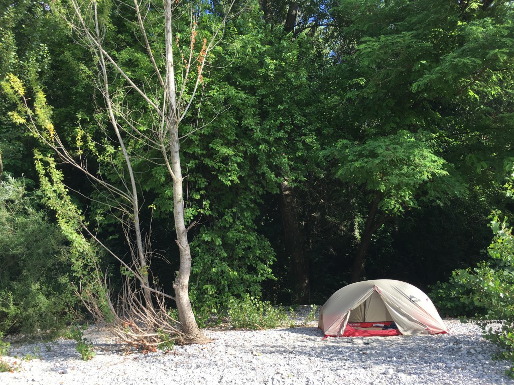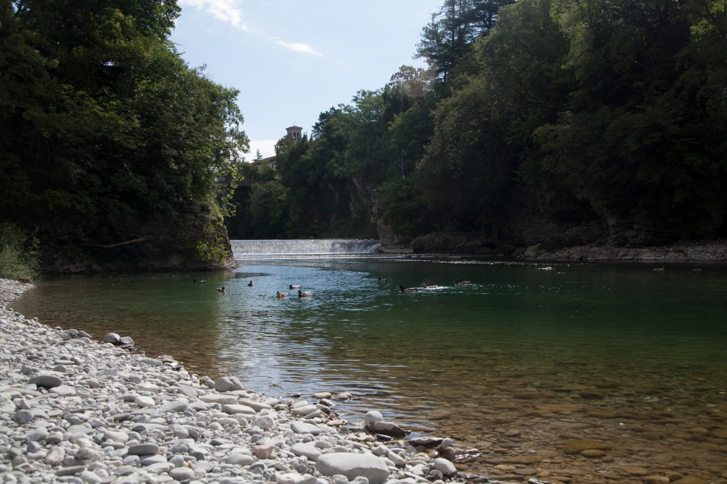 I stepped outside my tent, blue sky with pieces of clouds and river at front, rainfall under an arch bridge that not high and close enough to spray you though. An old woman walking by with a puppy and a plastic bag of duck food in hand. She fed them and the scene almost made me sob. We couldn’t chat as I couldn’t understand what she said though, I could still give her a “Ciao” and a global facial language. Brushed near the river, took a small box of salad mixed with bean and chicken cubes that I bought yesterday and played stone skipping over the river for half an hour. Packed and left two hours later.