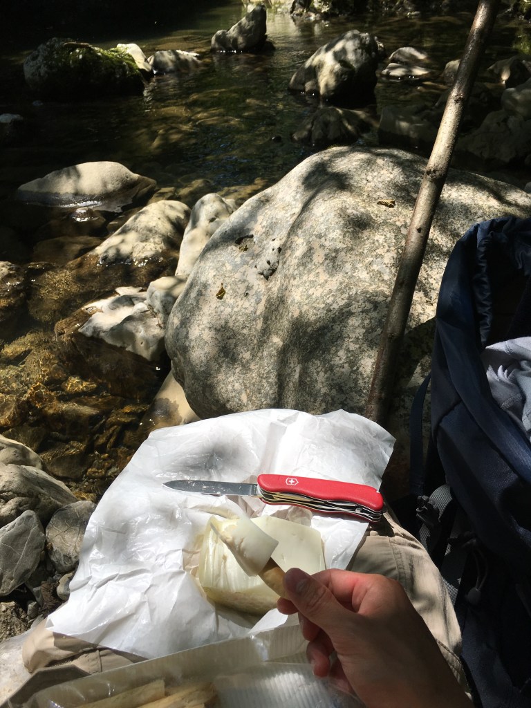 It was interesting walking just near the countryline between Italy and Slovenia and actually the countryline is just the river. I paused once maybe near P.te Clinaz, ate biscuit fingers with goat cheese given by Carlo there, wonderful. I carved my wood rod that Carlo gave me today morning, played slingshot and rested for a while and continued my journey. The road seemed to become longer from Melina as concrete road began, with my backpack weighed about 7kg I spent almost 7 hours arriving Carlo’s friend Fulvio house. I saw three mountainbikers, one asked me to take picture for him, and two chatted for a while. A vehicle I saw twice greeted me outside the window when it drove back uphill. It seemed rare to see an Asian walking on the unpopular-hiking route under big hot sun, right?