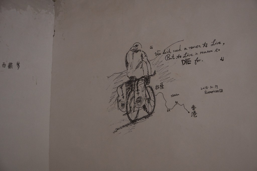 這天晚上,我在房間的牆上留下了自己騎行的背影。我泡著熱茶,躺在電熱毯上睄了一下地圖,前面是七座四千至五千米海拔的高山,其中兩座更超過五千米。人生或許就跟吃加加麵一樣,不需要勉強去爭取一些功名利祿,只要能一步一步挑戰自己的極限就足夠了。