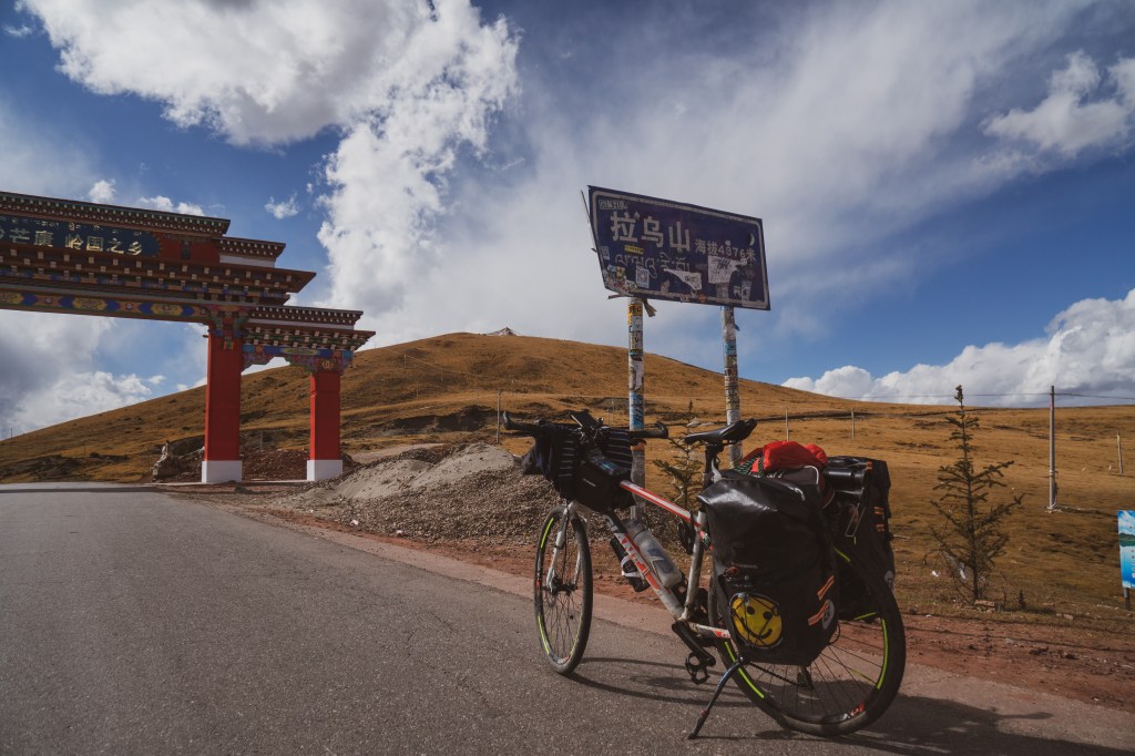 無他,能在拉烏山埡口能看到一望無際的藏式原野、數之不盡的耗牛和野鳥,還有軟綿的雲朵襯托著湖藍色的天空。此情此景此日子,我毫不耐煩地把車子放到一塊佈滿彩帶的字碑前面,坐在地上,毫不擔心一輛輛經過的貨車會碾過那比我的人命還要貴重的相機。